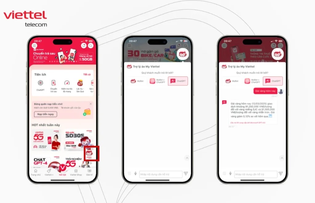 Không cần đăng ký rườm rà, không tốn một xu, chỉ cần tải hoặc mở app My Viettel, bạn sẽ ngay lập tức được kết nối với ChatGPT – người bạn đồng hành thông minh, sẵn sàng hỗ trợ bất cứ lúc nào. Viettel tự hào tiên phong mang công nghệ AI đột phá này đến gần hơn với hàng triệu người dùng Việt Nam.